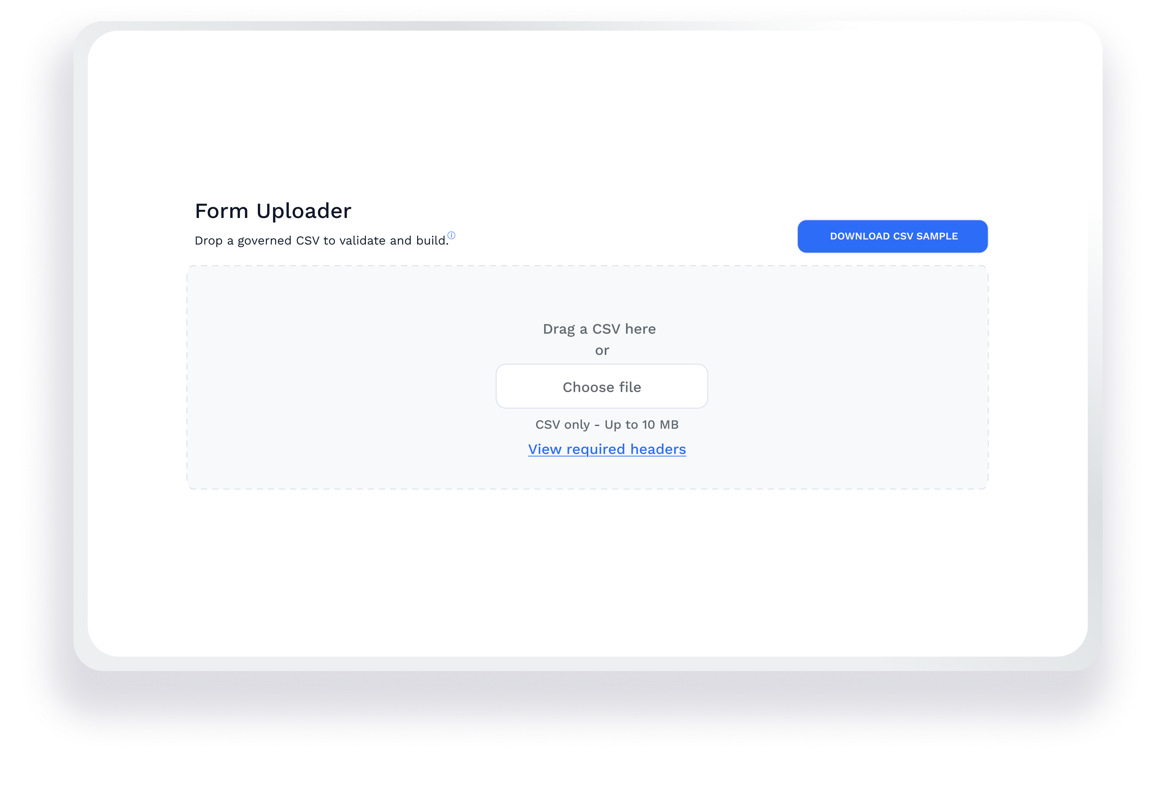 “Download CSV sample” — shows the governed contract up front.